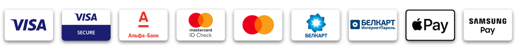 Мы принимаем платежи по следующим банковским картам: Visa, Mastercard, Verified-by-Visa, Mastercard Identity Check, Белкарт, Белкарт Интернет-пароль, Apple Pay и Альфа-Банк.